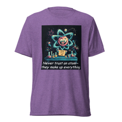 Science is fun T-Shirt, specific for scientists or science enthusiasts. Never trust an atom, they make up everything. The tri-blend fabric creates a vintage, fitted look. And extreme durability makes this t-shirt withstand repeated washings and still remain super comfortable. Image on the front of the shirt. • 50% polyester, 25% combed ring-spun cotton, 25% rayon • Fabric weight: 3.4 oz/yd² (115.3 g/m²) • Pre-shrunk for extra durability • 40 singles • Regular fit • Side-seamed construction • Blank product sourced from Guatemala, Nicaragua, Honduras, or the US