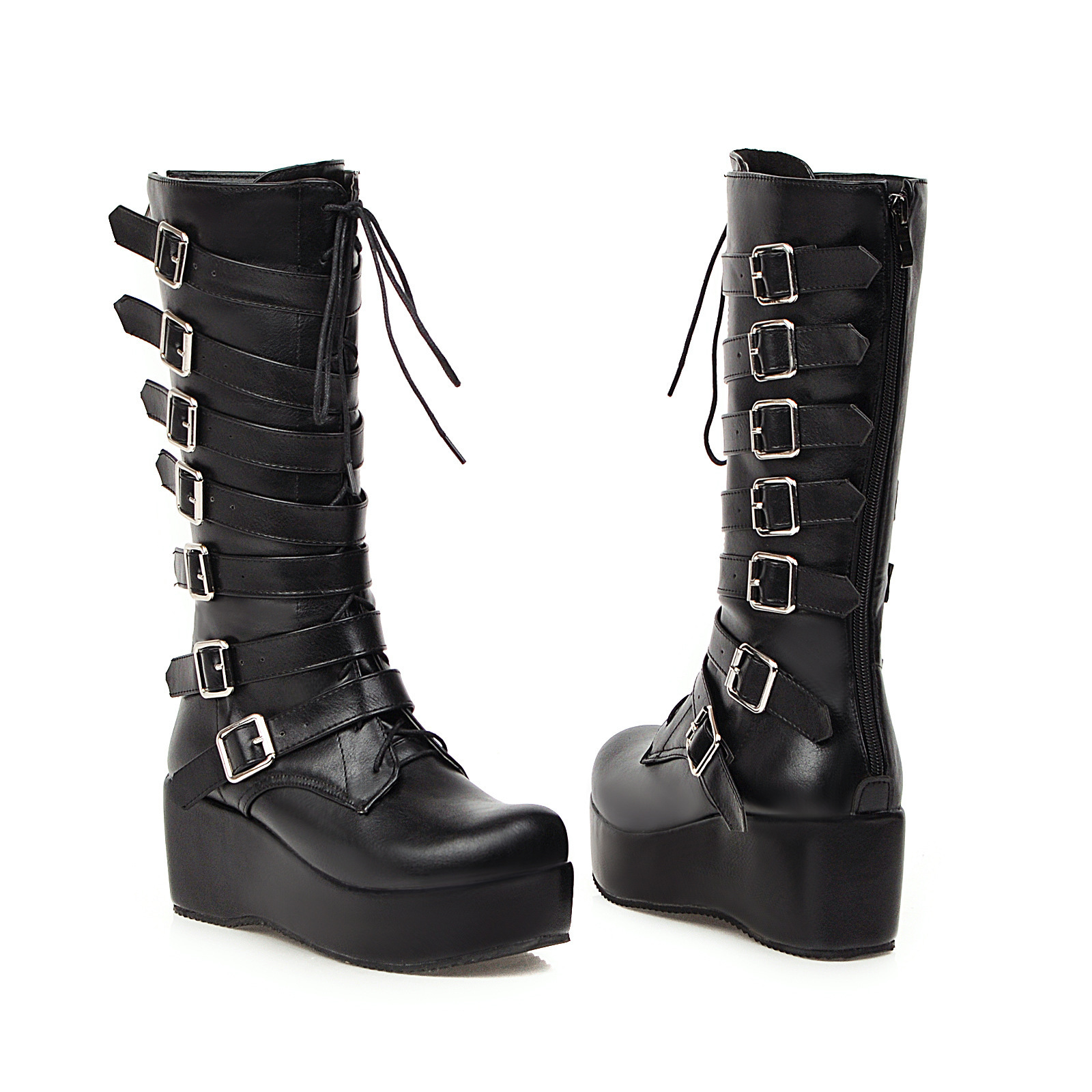 Fashionable Mid-Calf Wedge Boots with Buckle