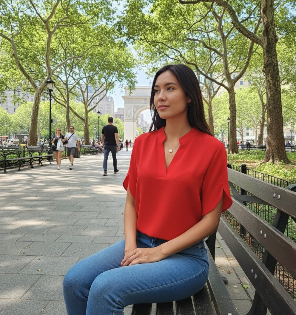 Upgrade your wardrobe with this timeless V-neck blouse, crafted to offer sophistication without sacrificing comfort. Made from high-quality, lightweight polyester, this short-sleeve top features a clean neckline, flattering silhouette, and subtle collage stitching detail for a refined touch of texture.