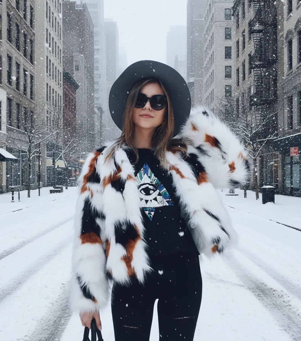 Turn any snowy street into your own fashion shoot with this Western-inspired faux fur coat. Crafted in ultra-soft white faux fur with rich brown and black patches, it mimics a chic cowhide pattern for that modern cowboy-girl vibe – bold, playful and seriously warm.